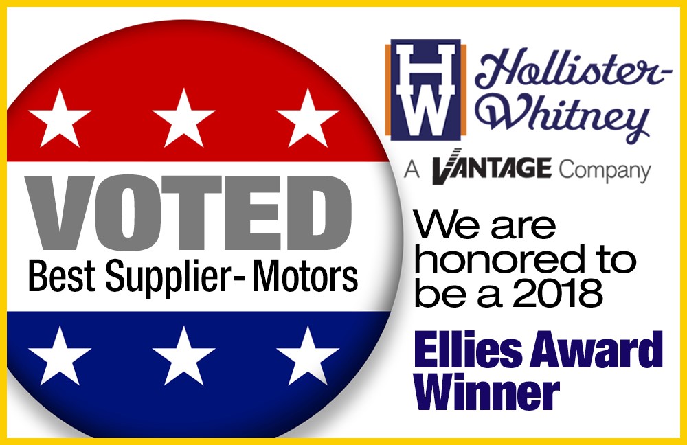 Hollister-Whitney, a member of the Vantage family of companies, is proud to have won a 2018 Ellie Award in the category of Best Supplier-Motors. The Ellies is a new award program from Elevator World Magazine, where companies of note are nominated and voted on by industry professionals. The purpose of the award is to recognize North American elevator and escalator industry businesses that go above and beyond for their customers, employees, communities and the industry as a whole. As a winner, Elevator World will highlight Hollister-Whitney in their December 2018 issue, and present the company with an Ellies statuette.